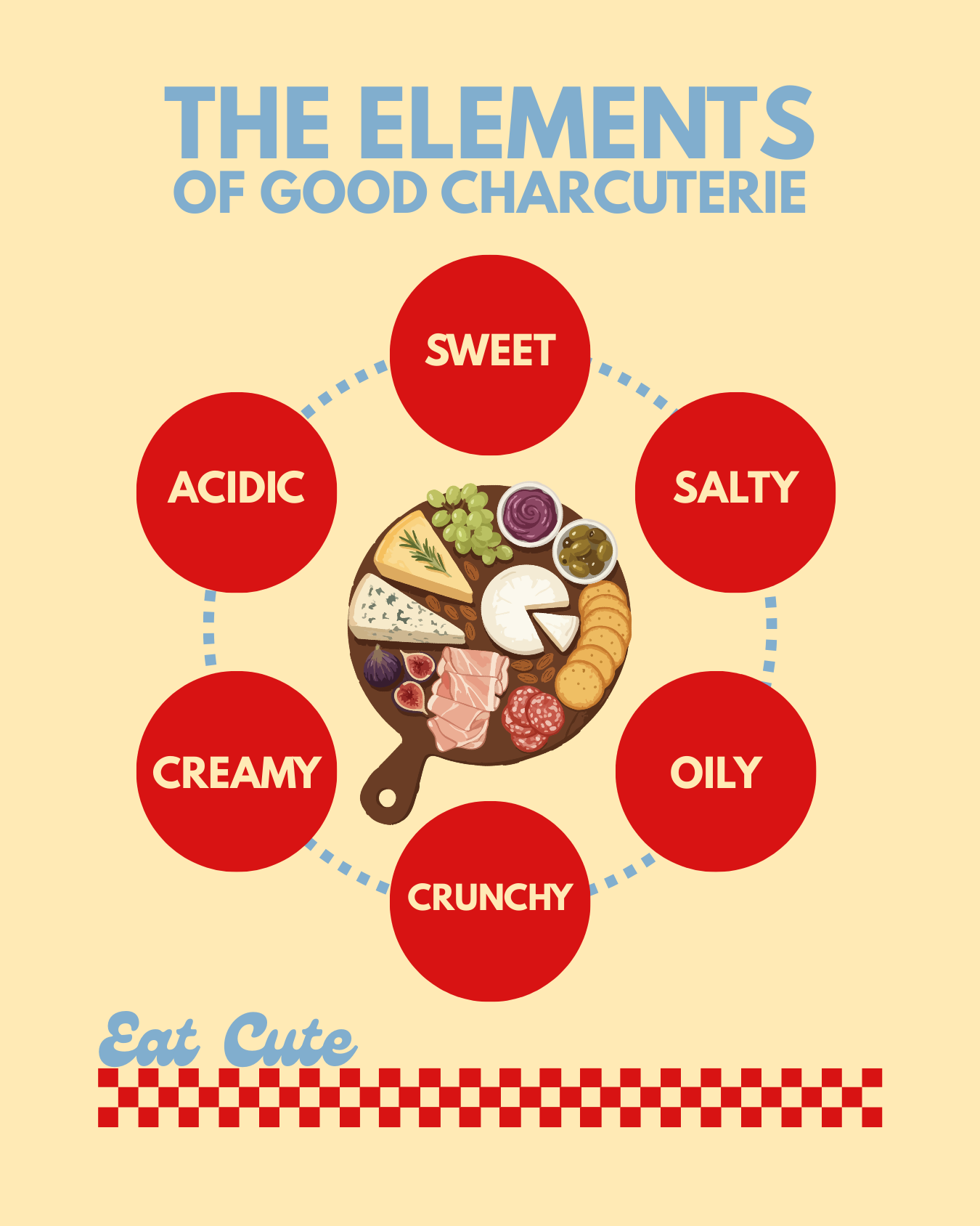 The Elements of Good Charcuterie 16 Mar Written By Taylor Fullerton The Elements of Good Charcuterie are Sweet, Salty, Oily, Acidic, Creamy, and Crunchy Taylor Fullerton https://eatcuteni.com